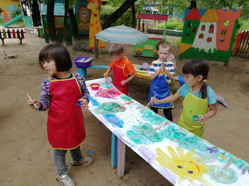 С помощью широких кистей нанесли рисунок на ватман, а после отправились на асфальт и продолжили.